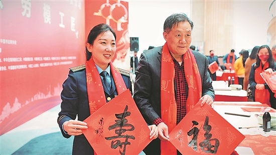 1月9日,由全国总工会指导,全国总工会宣传教育部、中国书法家协会主办,中国职工书法家协会、北京字节跳动科技有限公司承办的2023年“送万福、进万家”书法公益活动,在中国职工之家举办首场示范活动——“致敬劳模工匠”专场。(本报记者 白至洁 史宏宇)