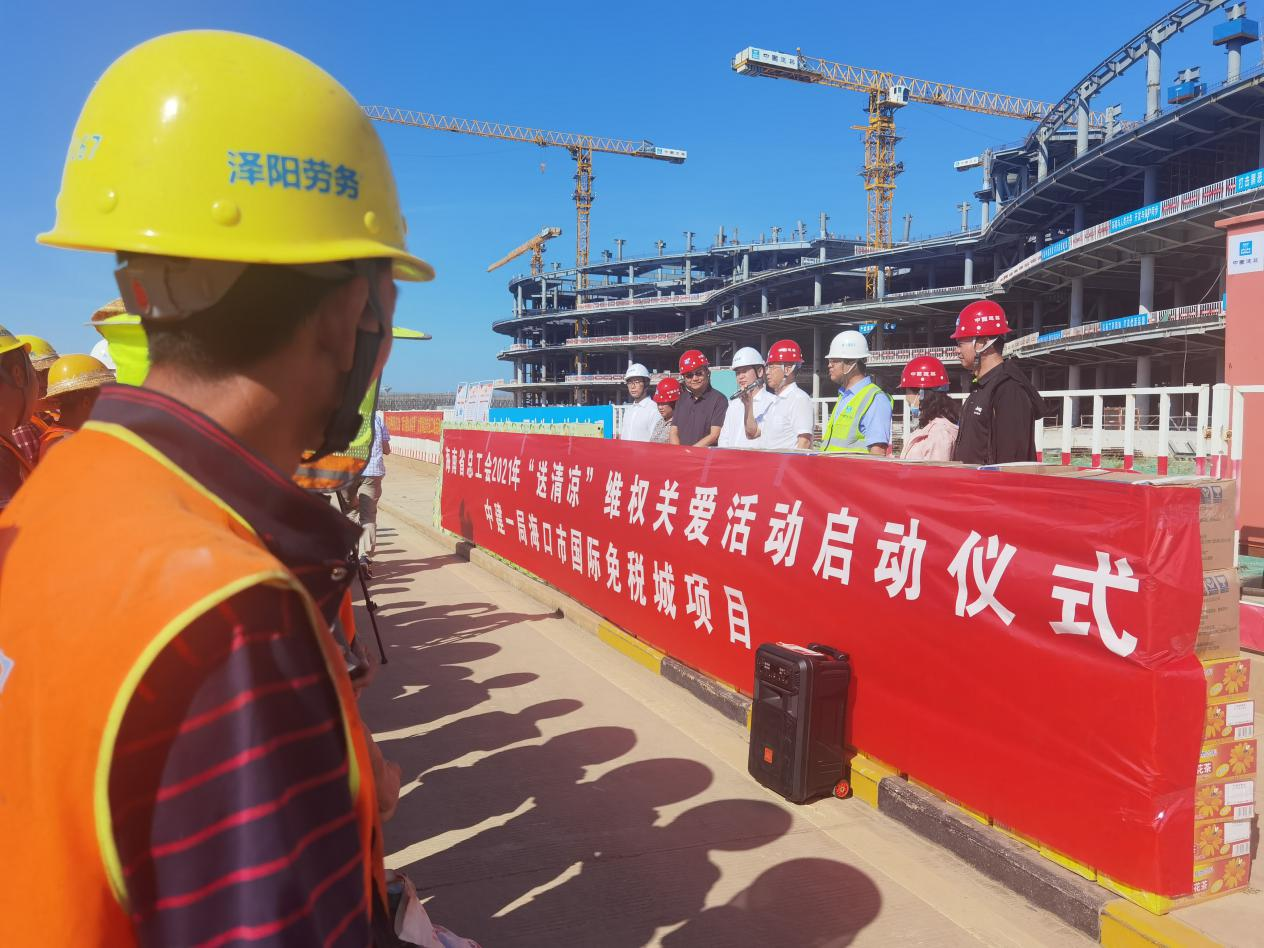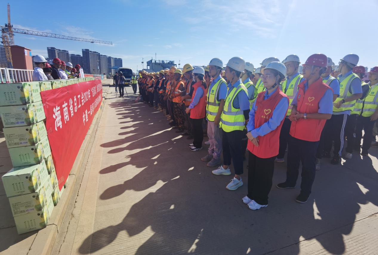 海南省总工会党组成员、副主席何清,中免(海口)投资发展有限公司总经理鞠凯勇,中建一局北京公司第六大项目党支部书记、项目经理姚顺民,海口市国际免税城项目管理人员、志愿者和工人代表参加活动。